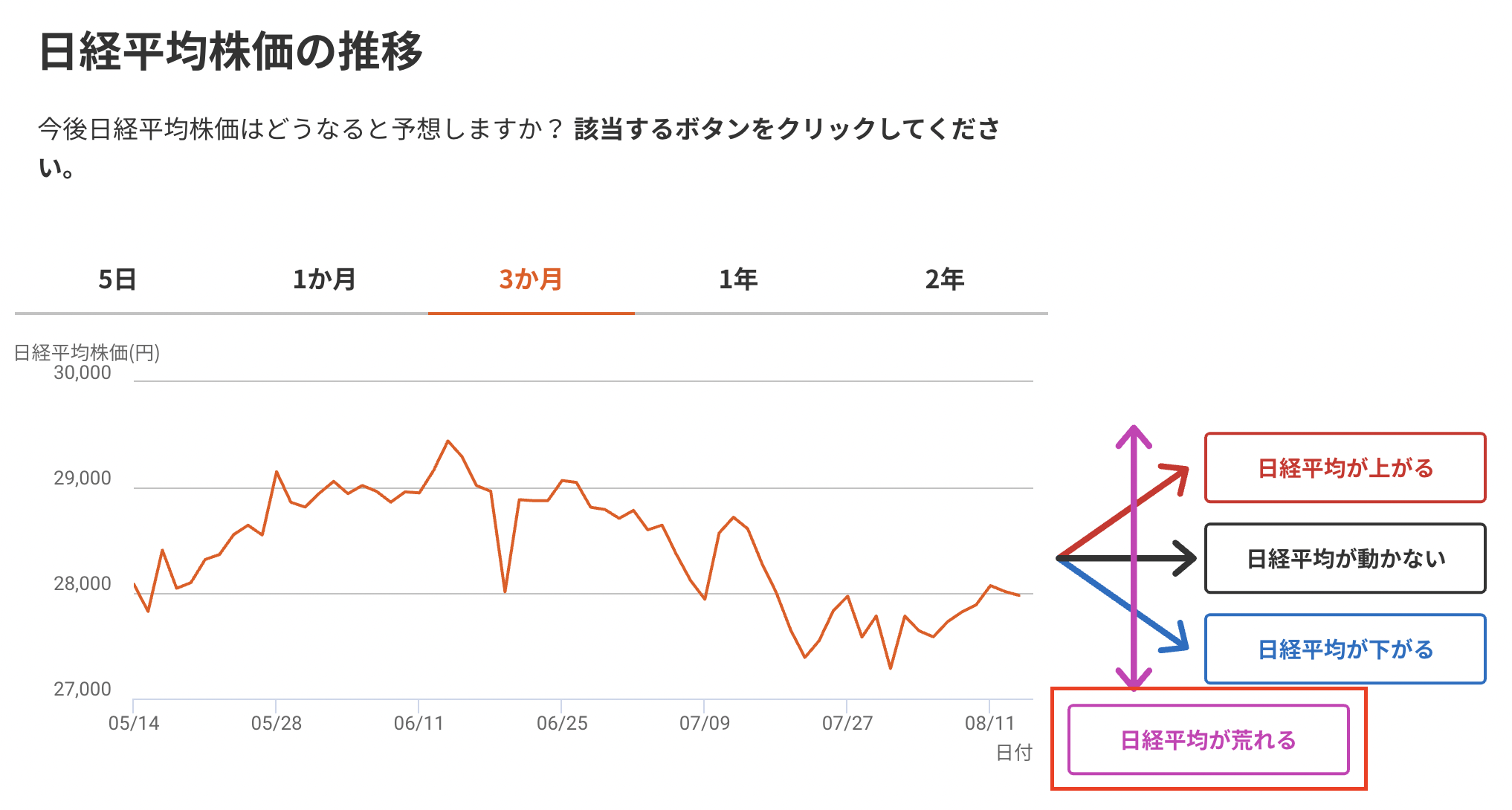 オプションシミュレーションにおいては、お客さまの相場見通しについて、「日経平均が上がる」「日経平均が下がる」「日経平均が動かない」「日経平均が荒れる」の4つから選択いただき、それに対し、具体的に有効とされる4つのストラテジー(合計16種類のポジション)を提示します。ストラテジー選択後、原資産(日経平均株価)の推移に対する損益曲線を確認いただきながら、細かく合成ポジションをカスタマイズいただくことが可能です。